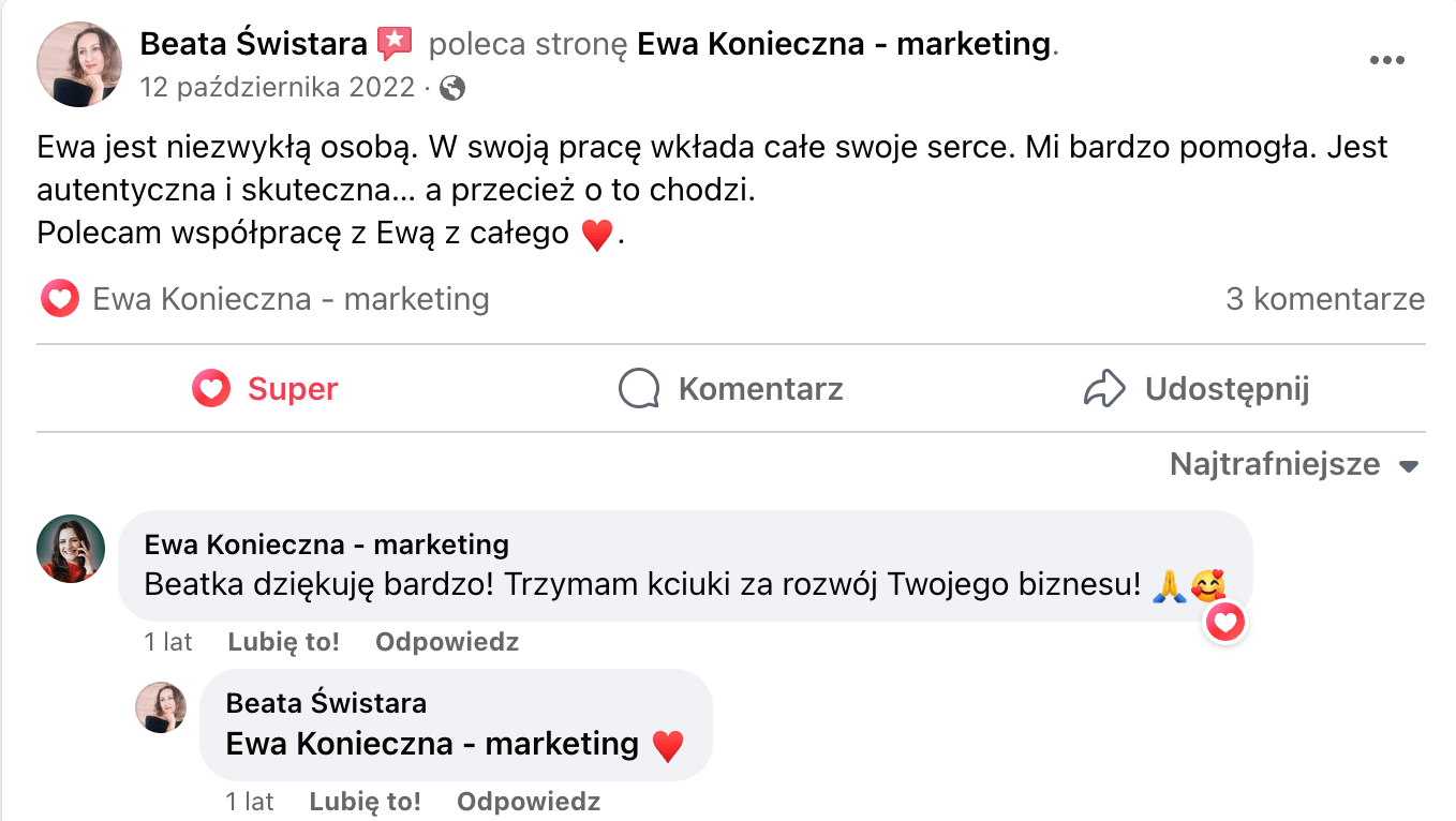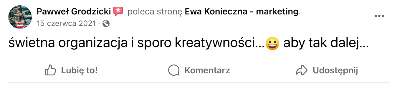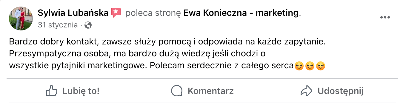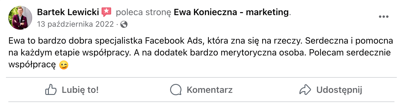 Od 4 lat prowadzę swój własny biznes oparty o marketing w social mediach. Specjalizuję się w kampaniach Facebook Ads i prowadzeniu profilii w mediach społecznościowych. Podczas naszych wspólnych treningów przekażę Ci całą swoją wiedzę i doświadczenie w pracy z klientami.